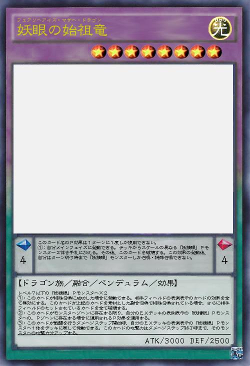| レベル7以下の「妖精眼」Pモンスター×2 ①:このカードが特殊召喚に成功した場合に発動できる。相手フィールドの表側表示のカードの効果を全て無効にする。このカードが上記のカードを素材とした融合召喚で特殊召喚されている場合、さらに相手フィールドのセットされているカードを全て破壊する。 ②:このカードがモンスターゾーンに存在する限り、自分のEXデッキの表側表示の「妖精眼」Pモンスターの、Pゾーンに存在する場合に適用されるP効果を適用する。 ③:このカードが戦闘を行うダメージステップ開始時、自分のEXデッキの表側表示の「妖精眼」Pモンスター1体をデッキに戻して発動できる。このカードの攻撃力はダメージステップ終了時まで、そのモンスターの攻撃力分アップする。 | |||