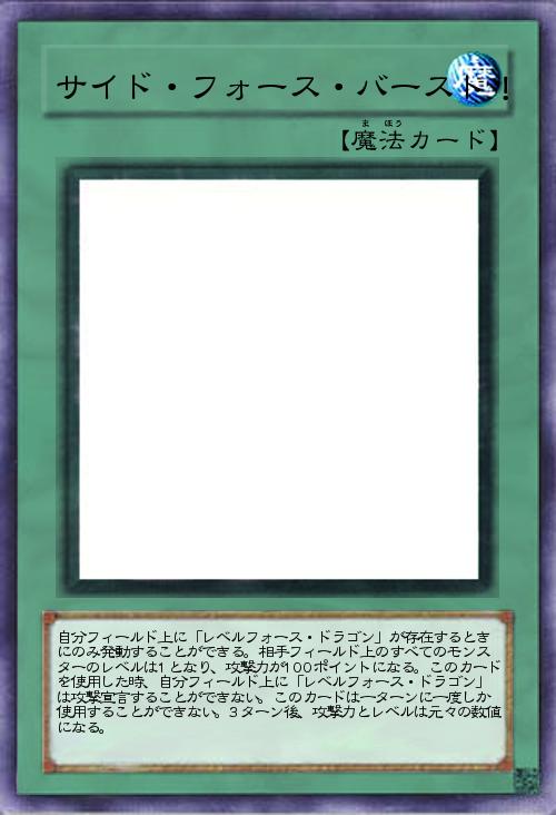 | 自分フィールド上に「レベルフォース・ドラゴン」が存在するときにのみ発動することができる。相手フィールド上のすべてのモンスターのレベルは1となり、攻撃力が100ポイントになる。このカードを使用した時、自分フィールド上に「レベルフォース・ドラゴン」は攻撃宣言することができない。このカードは一ターンに一度しか使用することができない。3ターン後、攻撃力とレベルは元々の数値になる。 | |||