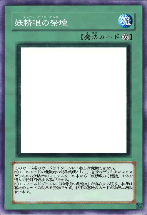 | このカード名のカードは1ターンに1枚しか発動できない。 ①:このカードの発動時の効果処理として、自分のデッキまたはEXデッキの表側表示のPモンスターの中から「妖精眼の守護狼」1体を選んで特殊召喚する事ができる。 ②:フィールドゾーンに「妖精眼の理想郷」が存在する限り、相手は墓地のカードの効果を発動できず、相手の墓地のカードの効果は無効化される。 | |||
