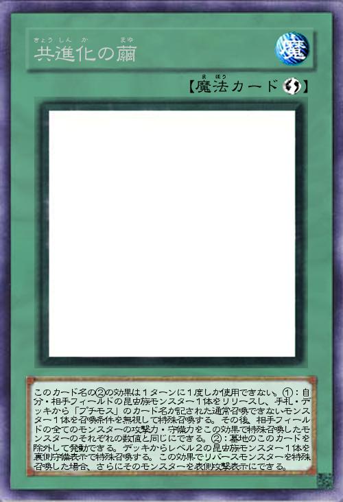 | このカード名の②の効果は1ターンに1度しか使用できない。①:自分・相手フィールドの昆虫族モンスター1体をリリースし、手札・デッキから「プチモス」のカード名が記された通常召喚できないモンスター1体を召喚条件を無視して特殊召喚する。その後、相手フィールドの全てのモンスターの攻撃力・守備力をこの効果で特殊召喚したモンスターのそれぞれの数値と同じにできる。②:自分メインフェイズに墓地のこのカードを除外して発動できる。デッキからレベル2の昆虫族モンスター1体を裏側守備表示で特殊召喚する。この効果でリバースモンスターを特殊召喚した場合、さらにそのモンスターを表側攻撃表示にできる。 | |||