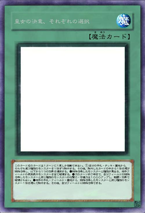| このカード名のカードは1ターンに1度しか発動できない。①:自分の手札・デッキ・墓地から、それぞれ違う種族のモンスターを1体ずつ除外する。その後、除外したカードの中から1体を選び特殊召喚し、以下から1つの効果を適用する。●特殊召喚したモンスターと種族が異なる、相手フィールドの表側表示モンスターを全て破壊する。●次のターン終了時まで、自分フィールドの特殊召喚したモンスターと同じ種族のモンスターの攻撃力・守備力は1000アップし、戦闘・効果で破壊されない。●相手の手札・フィールド・墓地から、特殊召喚したモンスターと同じ種族のモンスター1体を選んで除外する。その後、自分フィールドに特殊召喚できる。 | |||