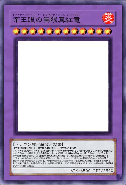 | 「帝王眼の真紅竜」+「帝王眼の真紅竜」+「帝王眼の真紅竜」 このカードは元々のカード名が上記のモンスターを融合素材とした融合召喚でしか特殊召喚出来ない。このカード名の(2)(3)の効果は1ターンに1度しか発動出来ない。(1)このカードはモンスター効果を受けない。(2)墓地の「帝王眼の真紅竜」を任意の数(最大3体)除外して発動出来る。フィールドのカード1枚を選んで除外し、除外したカード1枚につき1000このカードの攻撃力をターン終了時までアップする。(3)除外されている自分の「帝王眼の真紅竜」を3体まで対象として発動出来る。対象のモンスターを墓地に戻す。この効果を発動するターン、相手が受ける戦闘ダメージは倍になる。 | |||