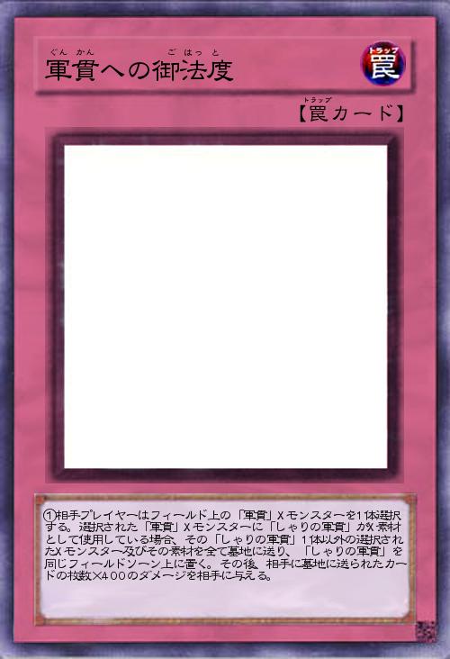 | ①相手プレイヤーはフィールド上の「軍貫」Xモンスターを1体選択する。選択された「軍貫」Xモンスターに「しゃりの軍貫」がX素材として使用している場合、その「しゃりの軍貫」1体以外の選択されたXモンスター及びその素材を全て墓地に送り、「しゃりの軍貫」を同じフィールドソーン上に置く。その後、相手に墓地に送られたカードの枚数×400のダメージを相手に与える。 | |||