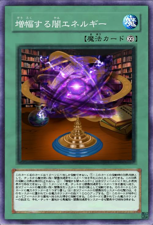 | このカード名のカードは1ターンに1枚しか発動できない。①:このカードの発動時の効果処理として、デッキから魔法使い族・闇属性通常モンスター1体を手札に加えることができる。この効果の発動と効果は無効化されない。②:「増幅する闇エネルギー」は自分フィールドに1枚しか表側表示で存在できない。③:1ターンに1度、デッキから闇属性通常モンスター1体を墓地へ送り、自分フィールドの魔法使い族・闇属性モンスター1体を対象として発動できる。そのカードとこのカードに魔力カウンターを1つずつ置く。④:自分フィールドの闇属性モンスターの攻撃力は、そのモンスターに置かれている魔力カウンターの数×1000アップする。⑤:このカードが相手によってフィールドから墓地へ送られた場合に発動できる。このカードに置かれていた魔力カウンターの数まで、手札・デッキ・墓地から悪魔族・闇属性通常モンスターを攻撃表示で特殊召喚する。 | |||