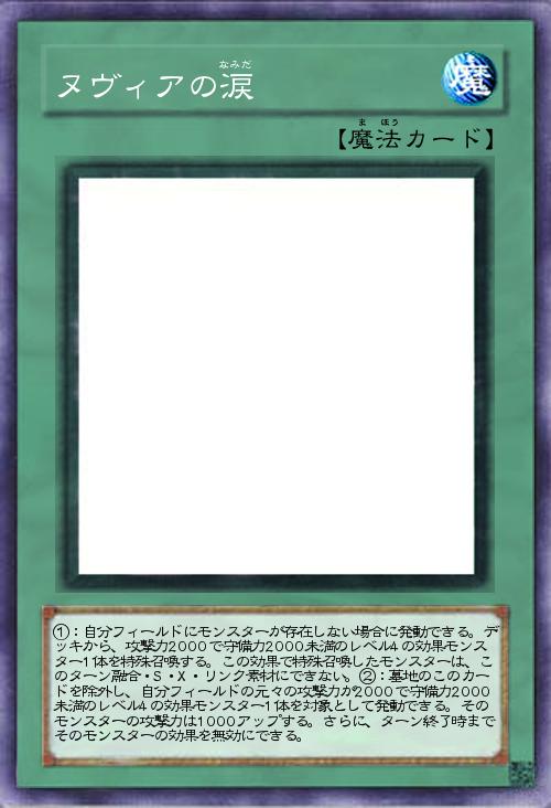 | ①:自分フィールドにモンスターが存在しない場合に発動できる。デッキから、攻撃力2000で守備力2000未満のレベル4の効果モンスター1体を特殊召喚する。この効果で特殊召喚したモンスターは、このターン融合・S・X・リンク素材にできない。②:墓地のこのカードを除外し、自分フィールドの元々の攻撃力が2000で守備力2000未満のレベル4の効果モンスター1体を対象として発動できる。そのモンスターの攻撃力は1000アップする。さらに、ターン終了時までそのモンスターの効果を無効にできる。 | |||