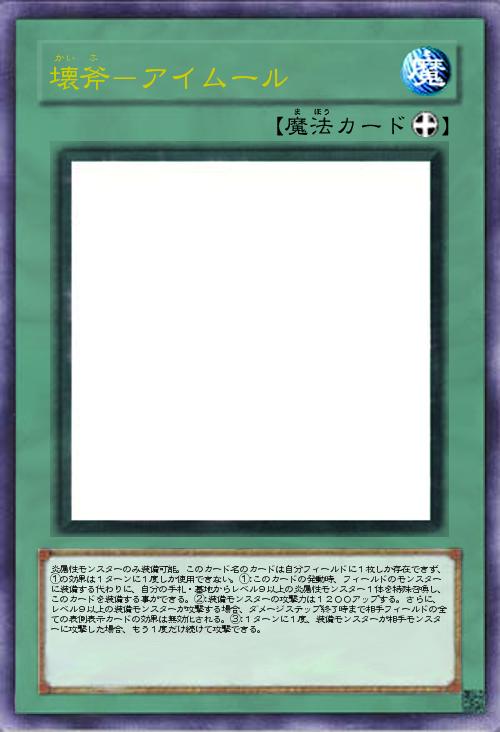 | 炎属性モンスターのみ装備可能。このカード名のカードは自分フィールドに1枚しか存在できず、①の効果は1ターンに1度しか使用できない。①:このカードの発動時、フィールドのモンスターに装備する代わりに、自分の手札・墓地からレベル9以上の炎属性モンスター1体を特殊召喚し、このカードを装備する事ができる。②:装備モンスターの攻撃力は1200アップする。さらに、レベル9以上の装備モンスターが攻撃する場合、ダメージステップ終了時まで相手フィールドの全ての表側表示カードの効果は無効化される。③:1ターンに1度、装備モンスターが相手モンスターに攻撃した場合、もう1度だけ続けて攻撃できる。 | |||
