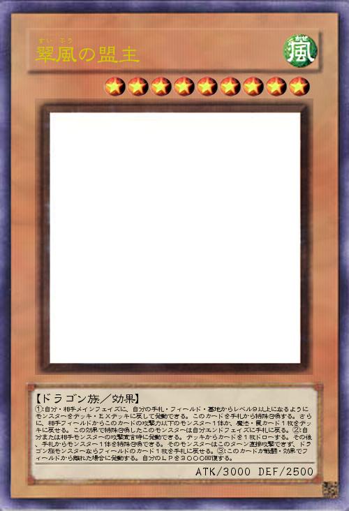 | ①:自分・相手メインフェイズに、自分の手札・フィールド・墓地からレベル9以上になるようにモンスターをデッキ・EXデッキに戻して発動できる。このカードを手札から特殊召喚する。さらに、相手フィールドからこのカードの攻撃力以下のモンスター1体か、魔法・罠カード1枚をデッキに戻せる。この効果で特殊召喚したこのモンスターは自分エンドフェイズに手札に戻る。②:自分または相手モンスターの攻撃宣言時に発動できる。デッキからカードを1枚ドローする。その後、手札からモンスター1体を特殊召喚できる。そのモンスターはこのターン直接攻撃できず、ドラゴン族モンスターならフィールドのカード1枚を手札に戻せる。③:このカードが戦闘・効果でフィールドから離れた場合に発動する。自分のLPを3000回復する。 | |||