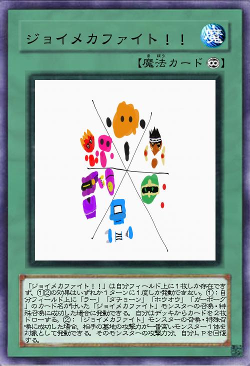 | 「ジョイメカファイト!!」は自分フィールド上に1枚しか存在できず、①②の効果はいずれか1ターンに1度しか発動できない。①:自分フィールド上に「ラー」「ダチョーン」「ホウオウ」「ガーボーグ」のカード名が付いた「ジョイメカファイト」モンスターの召喚・特殊召喚に成功した場合に発動できる。自分はデッキからカードを2枚ドローする。②:「ジョイメカファイト」モンスターの召喚・特殊召喚に成功した場合、相手の墓地の攻撃力が一番高いモンスター1体を対象として発動できる。そのモンスターの攻撃力分、自分LPを回復する。 | |||