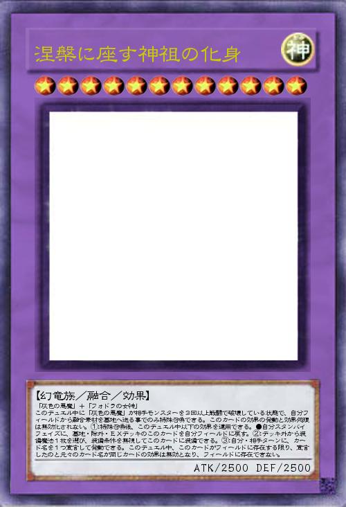 | 「灰色の悪魔」+「フォドラの女神」 このデュエル中に「灰色の悪魔」が相手モンスターを3回以上戦闘で破壊している状態で、自分フィールドから融合素材を墓地へ送る事でのみ特殊召喚できる。このカードの効果の発動と効果処理は無効化されない。①:特殊召喚後、このデュエル中以下の効果を適用できる。●自分スタンバイフェイズに、墓地・除外・EXデッキのこのカードを自分フィールドに戻す。②:デッキ外から装備魔法1枚を選び、装備条件を無視してこのカードに装備できる。③:自分・相手ターンに、カード名を1つ宣言して発動できる。このデュエル中、このカードがフィールドに存在する限り、宣言したのと元々のカード名が同じカードの効果は無効となり、フィールドに存在できない。 | |||
