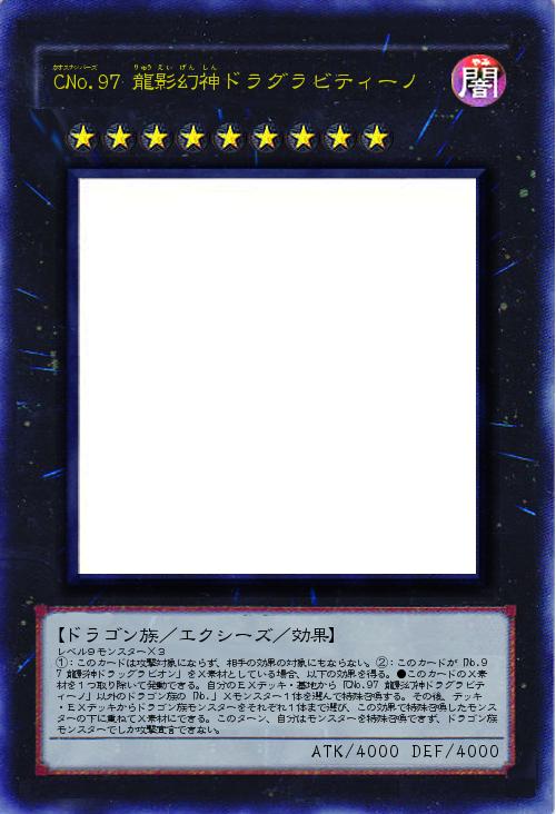 | レベル9モンスター×3 ①:このカードは攻撃対象にならず、相手の効果の対象にもならない。②:このカードが「No.97 龍影神ドラッグラビオン」をX素材としている場合、以下の効果を得る。●このカードのX素材を1つ取り除いて発動できる。自分のEXデッキ・墓地から「CNo.97 龍影幻神ドラグラビティーノ」以外のドラゴン族の「No.」Xモンスター1体を選んで特殊召喚する。その後、デッキ・EXデッキからドラゴン族モンスターをそれぞれ1体まで選び、この効果で特殊召喚したモンスターの下に重ねてX素材にできる。このターン、自分はモンスターを特殊召喚できず、ドラゴン族モンスターでしか攻撃宣言できない。 | |||