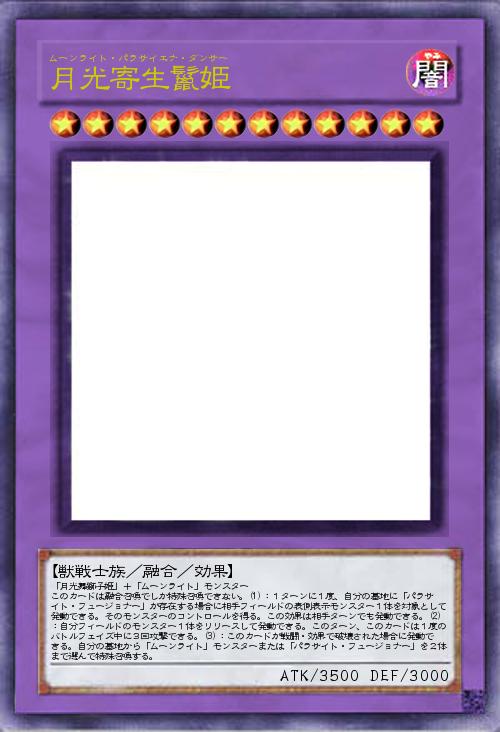 | 「月光舞獅子姫」+「ムーンライト」モンスター このカードは融合召喚でしか特殊召喚できない。(1):1ターンに1度、自分の墓地に「パラサイト・フュージョナー」が存在する場合に相手フィールドの表側表示モンスター1体を対象として発動できる。そのモンスターのコントロールを得る。この効果は相手ターンでも発動できる。(2):自分フィールドのモンスター1体をリリースして発動できる。このターン、このカードは1度のバトルフェイズ中に3回攻撃できる。(3):このカードが戦闘・効果で破壊された場合に発動できる。自分の墓地から「ムーンライト」モンスターまたは「パラサイト・フュージョナー」を2体まで選んで特殊召喚する。 | |||