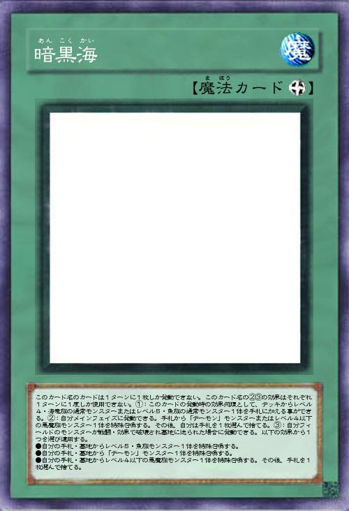 | このカード名のカードは1ターンに1枚しか発動できない。このカード名の②③の効果はそれぞれ1ターンに1度しか使用できない。①:このカードの発動時の効果処理として、デッキからレベル4・海竜族の通常モンスターまたはレベル5・魚族の通常モンスター1体を手札に加える事ができる。②:自分メインフェイズに発動できる。手札から「デーモン」モンスターまたはレベル4以下の悪魔族モンスター1体を特殊召喚する。その後、自分は手札を1枚選んで捨てる。③:自分フィールドのモンスターが戦闘・効果で破壊され墓地に送られた場合に発動できる。以下の効果から1つを選び適用する。 ●自分の手札・墓地からレベル5・魚族モンスター1体を特殊召喚する。 ●自分の手札・墓地から「デーモン」モンスター1体を特殊召喚する。 ●自分の手札・墓地からレベル4以下の悪魔族モンスター1体を特殊召喚する。その後、手札を1枚選んで捨てる。 | |||