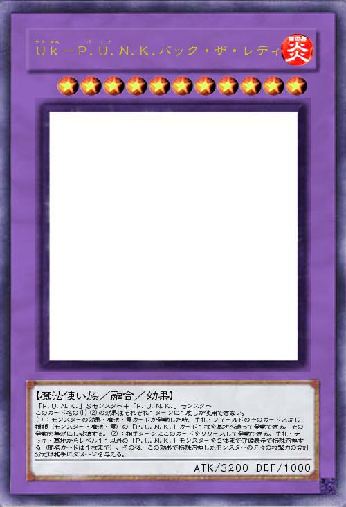 | 「P.U.N.K.」Sモンスター+「P.U.N.K.」モンスター このカード名の(1)(2)の効果はそれぞれ1ターンに1度しか使用できない。 (1):モンスターの効果・魔法・罠カードが発動した時、手札・フィールドのそのカードと同じ種類(モンスター・魔法・罠)の「P.U.N.K.」カード1枚を墓地へ送って発動できる。その発動を無効にし破壊する。(2):相手ターンにこのカードをリリースして発動できる。手札・デッキ・墓地からレベル11以外の「P.U.N.K.」モンスターを2体まで守備表示で特殊召喚する(同名カードは1枚まで)。その後、この効果で特殊召喚したモンスターの元々の攻撃力の合計分だけ相手にダメージを与える。 | |||
