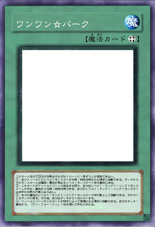 | このカード名の①③④の効果はそれぞれ1ターンに1度ずつしか使用できない。 ①:自分フィールドにレベル1モンスターが召喚・特殊召喚された場合に発動できる。デッキからそのモンスターとは種族・属性が異なるレベル1モンスター1体を墓地に送る。 ②:このカードがフィールドゾーンに存在する限り、自分はレベル1・ランク1・リンク1モンスターしか手札・墓地から召喚・特殊召喚できず、自分のレベル1・ランク1・リンク1モンスターは相手の効果の対象にならない。 ③:自分の墓地のレベル1・ランク1・リンク1モンスター3体対象として発動できる。そのカードをデッキに戻す。その後、自分はデッキから1枚ドローする。 ④:フィールドゾーンのこのカードが相手によって破壊された場合に発動できる。自分のデッキ・墓地から、「ワン・フォー・ワン」1枚を選んで手札に加える。 | |||