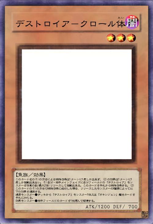 | このカード名の(1)の方法による特殊召喚は1ターンに1度しか出来ず、(2)の効果は1ターンに1度しか発動出来ない。(1)自分・相手メインフェイズに自分フィールドの「デストロイア」モンスターを任意の数(最大2体)リリースして発動出来る。このカードを手札から特殊召喚する。(2)このカードの(1)の方法で特殊召喚に成功した場合、リリースしたモンスターの種類によって以下の効果を適用する。 通常モンスター●デッキから「デストロイア」モンスター1体又は「オキシジェン」魔法カードを手札に加える。 効果モンスター●相手フィールドのカードを1枚選んで破壊する。 | |||