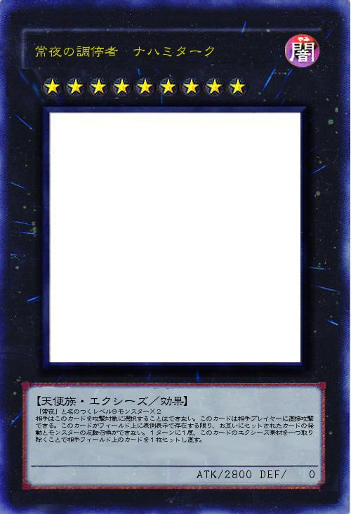 「現時点ではまだ出せませんが、最高ランクの常夜エクシーズです。永続効果は常に夜になっている様をイメージしているつもり…です(´-`)ハルヴァリーの存在を考慮して攻撃力はやや抑え目に。ナハミタークは魔術が暴走して偶然にも精製に成功した天使。周囲に夜をもたらす圧倒的な力は「常夜」の表舞台進出へのきっかけとなったのだとか!(`・ω・´)(厨二乙」(2012-07-23 06:08)