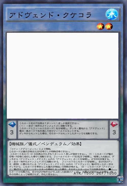 | 「コイン・アグリーメント」により降臨。 このカードは儀式召喚またはP召喚でしか特殊召喚できない。 このカード名の(1)(2)の効果はそれぞれ1ターンに1度しか使用できない。(1):このカードが儀式召喚・P召喚に成功した場合に発動できる。フィールドのカードを2枚まで破壊し、破壊した枚数分、デッキから「アドヴェンド・クケコラ」以外の「アドヴェンド」カードを破壊し、LPを500回復する。 (2):自分・相手のメインフェイズ1に発動できる。 フィールドのこのカードを破壊し、自分のEXデッキ(表側)に置かれている「アドヴェンド・クケコラ」以外の「アドヴェンド」儀式PモンスターをEXデッキから、このカードを素材とした儀式召喚扱いで特殊召喚する。 (3):このカードが「アドヴェンド」儀式Pモンスター・Lモンスターの素材となった場合、そのモンスターは以下の効果を得る。 ●このカードの攻撃力は、自分のLPが相手のLPを上回った数値分アップし、攻撃力が2500以上の場合、相手の効果によって破壊されず、手札に戻せない。 | |||