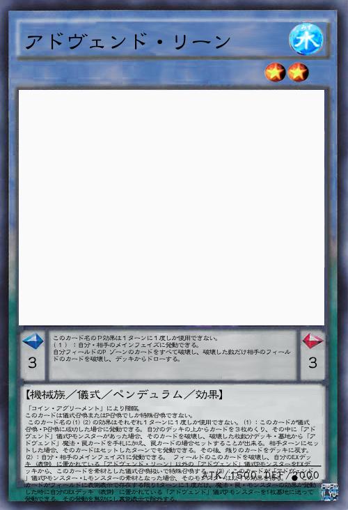 | 「コイン・アグリーメント」により降臨。 このカードは儀式召喚またはP召喚でしか特殊召喚できない。 このカード名の(1)(2)の効果はそれぞれ1ターンに1度しか使用できない。(1):このカードが儀式召喚・P召喚に成功した場合に発動できる。自分のデッキの上からカードを3枚めくり、その中に「アドヴェンド」儀式Pモンスターがあった場合、そのカードを破壊し、破壊した枚数分デッキ・墓地から「アドヴェンド」魔法・罠カードを手札に加え、罠カードの場合セットすることが出来る。相手ターンにセットした場合、そのカードはセットしたターンでも発動できる。その後、残りのカードをデッキに戻す。 (2):自分・相手のメインフェイズ1に発動できる。 フィールドのこのカードを破壊し、自分のEXデッキ(表側)に置かれている「アドヴェンド・リーン」以外の「アドヴェンド」儀式PモンスターをEXデッキから、このカードを素材とした儀式召喚扱いで特殊召喚する。 (3):このカードが「アドヴェンド」儀式Pモンスター・Lモンスターの素材となった場合、そのモンスターは以下の効果を得る。 ● このカードがフィールドに表側表示で存在する限り1ターンに1度だけ、魔法・罠・モンスターの効果が発動した時に自分のEXデッキ(表側)に置かれている「アドヴェンド」儀式Pモンスターを1枚墓地に送って発動できる。その発動を無効にし裏側表示で除外する。 | |||