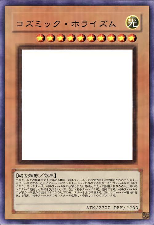 | このカードを表側表示でA召喚する場合、相手フィールドの攻撃力または守備力が0のモンスターもリリースできる。①:このカードがモンスターゾーンに存在する限り、自分フィールドの「ホライズム」モンスターは、相手フィールドの攻撃力または守備力が元々の数値より500以上低いモンスターの発動した効果を受けない。②:自分・相手ターンに1度、発動できる。相手フィールドの攻撃力・守備力の合計が1000以下のモンスターを全て破壊する。③:このカードが墓地に存在する限り、相手フィールドのモンスターの攻撃力・守備力は100ダウンする。 | |||