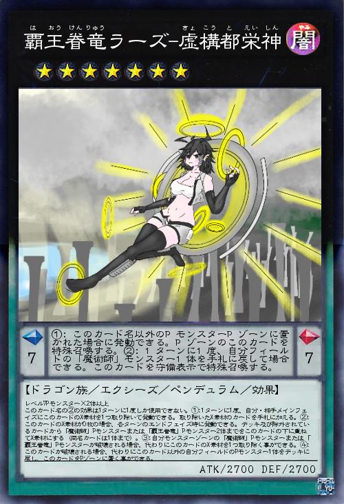 | レベル7Pモンスター×2体以上 このカード名の②の効果は1ターンに1度しか使用できない。①:1ターンに1度、自分・相手メインフェイズにこのカードのX素材を1つ取り除いて発動できる。取り除いたX素材のカードを手札に加える。②:このカードのX素材が0枚の場合、各ターンのエンドフェイズ時に発動できる。デッキ及び除外されているカードから「魔術師」Pモンスターまたは「覇王眷竜」Pモンスター2体までをこのカードの下に重ねてX素材にする(同名カードは1体まで)。③:自分モンスターゾーンの「魔術師」Pモンスターまたは「覇王眷竜」Pモンスターが破壊される場合、代わりにこのカードのX素材を1つ取り除く事ができる。④:このカードが破壊される場合、代わりにこのカード以外の自分フィールドのPモンスター1体をデッキに戻し、このカードをPゾーンに置く事ができる。 | |||