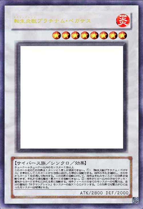 | チューナー+チューナー以外のモンスター1体以上 このカード名の①の効果は1ターンに1度しか使用できない。①:「転生炎獣プラチナム・ペガサス」を素材としてこのカードがS召喚に成功した場合に発動できる。相手の手札を確認し、その中からカード1枚を選んで除外する。この効果の発動に対して、相手は手札のモンスターの効果を発動できず、手札から速攻魔法・罠カードを発動できない。②:相手がドロー以外の方法でデッキ・墓地からカードを手札に加える度に発動する。相手フィールドの全てのモンスターの攻撃力は、自分の墓地の「サラマングレイト」モンスターの数×100ダウンする。この効果で攻撃力が0になったモンスターは破壊される。 | |||
