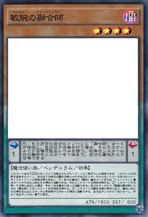 | このカード名の①②③のモンスター効果はそれぞれ1ターンに1度ずつしか使用できず、このカードの効果を使用するターン、自分はP召喚及び融合召喚以外の方法でEXデッキからモンスターを自分のメインモンスターゾーンに特殊召喚できない。①:自分の墓地に「融合」魔法カードまたは「フュージョン」魔法カードが3枚以上存在する場合に発動できる。手札のこのカードを特殊召喚する。②:このカードが召喚・P召喚に成功した場合、手札1枚を墓地に送って発動できる。自分のデッキから「敏腕の融合師」以外の「融合師」Pモンスター1体を特殊召喚する。③:このカードが融合召喚の素材になり、墓地へ送られた場合またはEXデッキに表側表示で加わった場合に発動できる。自分はデッキから1枚ドローし、手札1枚をデッキの一番下に戻す。 | |||