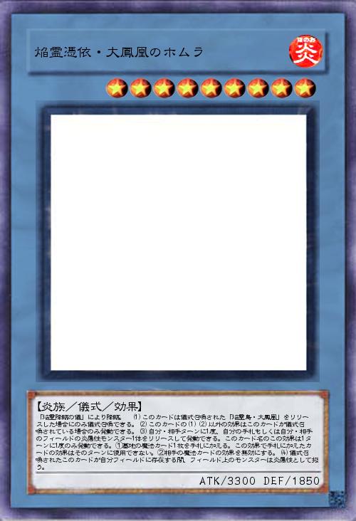 | 「焔霊降臨の儀」により降臨。 (1)このカードは儀式召喚された「焔霊鳥・大鳳凰」をリリースした場合にのみ儀式召喚できる。(2)このカードの(1)(2)以外の効果はこのカードが儀式召喚されている場合のみ発動できる。(3)自分・相手ターンに1度、自分の手札もしくは自分・相手のフィールドの炎属性モンスター1体をリリースして発動できる。このカード名のこの効果は1ターンに1度のみ発動できる。①墓地の魔法カード1枚を手札に加える。この効果で手札に加えたカードの効果はそのターンに使用できない。②相手の魔法カードの効果を無効にする。(4)儀式召喚されたこのカードが自分フィールドに存在する間、フィールド上のモンスターは炎属性として扱う。 | |||