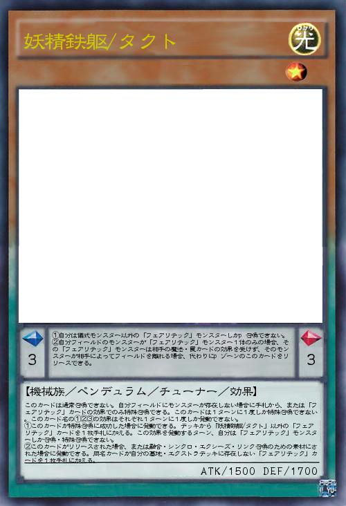 | このカードは通常召喚できない。自分フィールドにモンスターが存在しない場合に手札から、または「フェアリテック」カードの効果でのみ特殊召喚できる。このカードは1ターンに1度しか特殊召喚できない。このカード名の①②③の効果はそれぞれ1ターンに1度しか発動できない。 ①このカードが特殊召喚に成功した場合に発動できる。デッキから「妖精鉄躯/タクト」以外の「フェアリテック」カードを1枚手札に加える。この効果を発動するターン、自分は「フェアリテック」モンスターしか召喚・特殊召喚できない。 ②このカードがリリースされた場合、または融合・シンクロ・エクシーズ・リンク召喚のための素材にされた場合に発動できる。同名カードが自分の墓地・エクストラデッキに存在しない「フェアリテック」カードを1枚手札に加える。 | |||