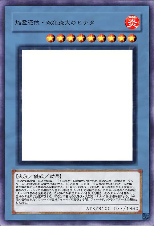 | 「焔霊降臨の儀」により降臨。 (1)このカードは儀式召喚された「焔霊双犬・双狛炎犬」をリリースした場合にのみ儀式召喚できる。(2)このカードの(1)(2)以外の効果はこのカードが儀式召喚されている場合のみ発動できる。(3)自分・相手ターンに1度、自分の手札もしくは自分・相手のフィールドの炎属性モンスター1体をリリースして発動できる。このカード名のこの効果は1ターンに1度のみ発動できる。①相手の効果でダメージを受けた場合、そのダメージを無効化し自分のLPを同じ数値回復する。②自分の墓地の炎属性・炎族モンスター1体を特殊召喚する。(4)儀式召喚されたこのカードが自分フィールドに存在する間、フィールド上のモンスターは炎属性として扱う。 | |||