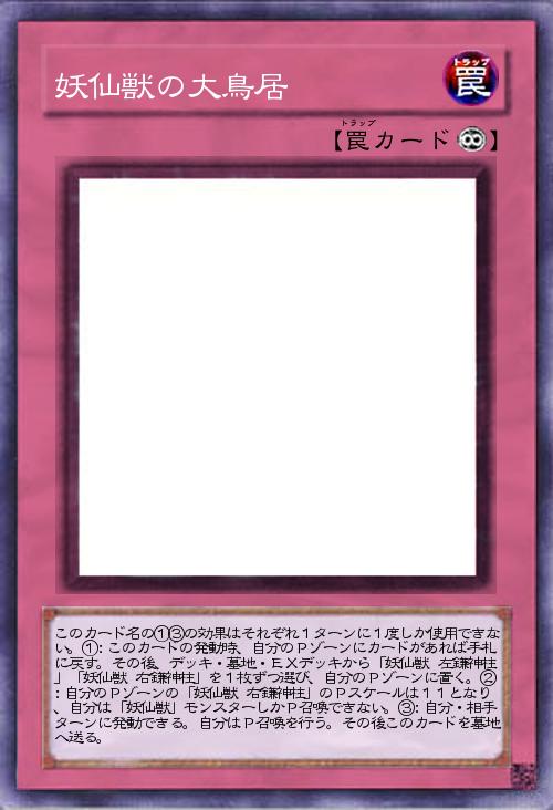 | このカード名の①③の効果はそれぞれ1ターンに1度しか使用できない。①:このカードの発動時、自分のPゾーンにカードがあれば手札に戻す。その後、デッキ・墓地・EXデッキから「妖仙獣 左鎌神柱」「妖仙獣 右鎌神柱」を1枚ずつ選び、自分のPゾーンに置く。②:自分のPゾーンの「妖仙獣 右鎌神柱」のPスケールは11となり、自分は「妖仙獣」モンスターしかP召喚できない。③:自分・相手ターンに発動できる。自分はP召喚を行う。その後このカードを墓地へ送る。 | |||