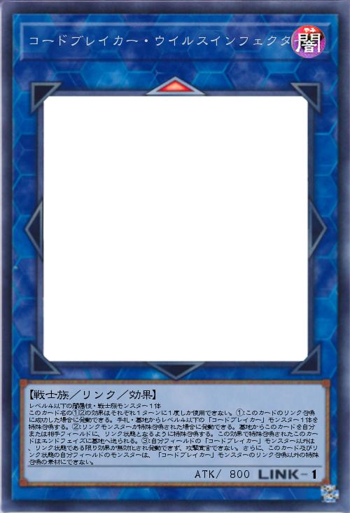 | レベル4以下の闇属性・戦士族モンスター1体 このカード名の①②の効果はそれぞれ1ターンに1度しか使用できない。①:このカードのリンク召喚に成功した場合に発動できる。手札・墓地からレベル4以下の「コードブレイカー」モンスター1体を特殊召喚する。②:リンクモンスターが特殊召喚された場合に発動できる。墓地からこのカードを自分または相手フィールドに、リンク状態となるように特殊召喚する。この効果で特殊召喚されたこのカードはエンドフェイズに墓地へ送られる。③:自分フィールドの「コードブレイカー」モンスター以外は、リンク状態である限り効果が無効化され発動できず、攻撃宣言できない。さらに、このカード及びリンク状態の自分フィールドのモンスターは、「コードブレイカー」モンスターのリンク召喚以外の特殊召喚の素材にできない。 | |||