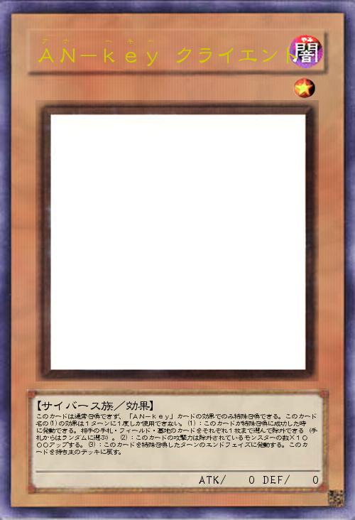 | このカードは通常召喚できず、「AN-key」カードの効果でのみ特殊召喚できる。このカード名の(1)の効果は1ターンに1度しか使用できない。(1):このカードが特殊召喚に成功した時に発動できる。相手の手札・フィールド・墓地のカードをそれぞれ1枚まで選んで除外できる(手札からはランダムに選ぶ)。(2):このカードの攻撃力は除外されているモンスターの数×1000アップする。(3):このカードを特殊召喚したターンのエンドフェイズに発動する。このカードを持ち主のデッキに戻す。 | |||