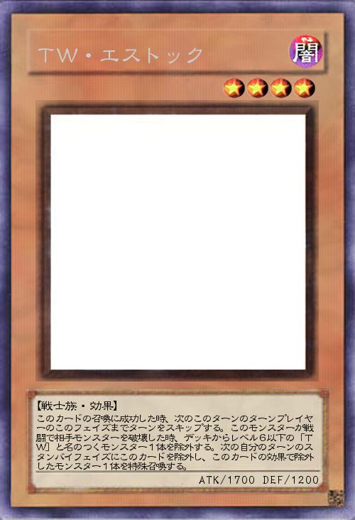 | このカードの召喚に成功した時、次のこのターンのターンプレイヤーのこのフェイズまでターンをスキップする。このモンスターが戦闘で相手モンスターを破壊した時、デッキからレベル6以下の「TW]と名のつくモンスター1体を除外する。次の自分のターンのスタンバイフェイズにこのカードを除外し、このカードの効果で除外したモンスター1体を特殊召喚する。 | |||