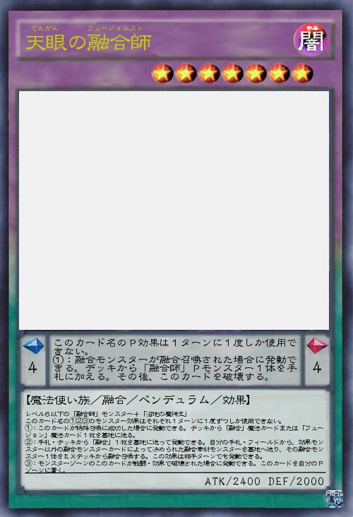 | このカード名のP効果は1ターンに1度しか使用できない。 ①:融合モンスターが融合召喚された場合に発動できる。デッキから「融合師」Pモンスター1体を手札に加える。その後、このカードを破壊する。 | |||