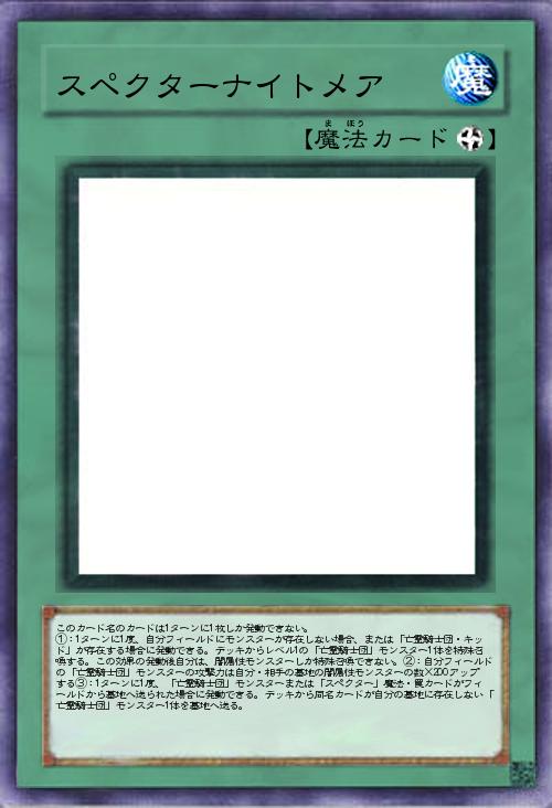 | このカード名のカードは1ターンに1枚しか発動できない。 ①:1ターンに1度、自分フィールドにモンスターが存在しない場合、または「亡霊騎士団・キッド」が存在する場合に発動できる。デッキからレベル1の「亡霊騎士団」モンスター1体を特殊召喚する。この効果の発動後自分は、闇属性モンスターしか特殊召喚できない。②:自分フィールドの「亡霊騎士団」モンスターの攻撃力は自分・相手の墓地の闇属性モンスターの数×200アップする③:1ターンに1度、「亡霊騎士団」モンスターまたは「スペクター」魔法・罠カードがフィールドから墓地へ送られた場合に発動できる。デッキから同名カードが自分の墓地に存在しない「亡霊騎士団」モンスター1体を墓地へ送る。 | |||