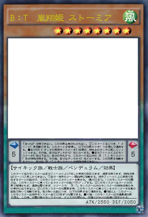 | このカード名のモンスターは自分フィールド上に1体しか表側で存在できず、通常召喚できず、特殊召喚は1ターンに1度しかできない。①自分・相手のターン開始時に発動する。相手フィールド上に表側で存在するカードの数だけ、このモンスターにカウンターを乗せる。(最大10まで。)このモンスターの攻撃力は、このモンスターに乗っているカウンターの数×150アップする。②このモンスターはカードの効果で破壊されず、直接攻撃できず、リリースや、「B:T」モンスター以外のモンスターの特殊召喚の為の素材にはできない。③このモンスターの攻撃宣言時、このモンスターに乗っているカウンターを任意の数取り除いて発動できる。取り除いた数につき、以下の効果を全て適用する。●5個以上:このターン、このモンスターは相手モンスター全てに1回ずつ攻撃できる。●10個:このモンスターは守備貫通効果を得る。この時、攻撃対象のモンスターは、ダメステの間のみ、守備力が半分の数値に固定される。 | |||