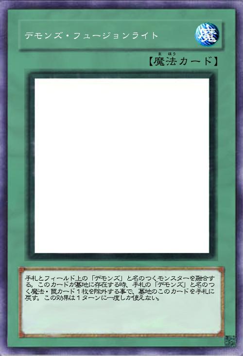| 手札とフィールド上の「デモンズ」と名のつくモンスターを融合する。このカードが墓地に存在する時、手札の「デモンズ」と名のつく魔法・罠カード1枚を除外する事で、墓地のこのカードを手札に戻す。この効果は1ターンに一度しか使えない。 | |||