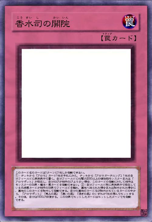 | このカード名のカードは1ターンに1枚しか発動できない。 ①:デッキから「アロマ」カード1枚を手札に加え、デッキから「アロマガーデニング」1枚を自分フィールドに表側表示で置く。自分フィールドに攻撃力2000以上の植物族モンスターまたは「アロマポット」が存在し、自分のLPが相手のLPより多い場合、このカードの発動に対して相手はモンスターの効果・魔法・罠カードを発動できない。②:自分フィールド既に表側表示で存在している永続罠カードが相手の効果でフィールドを離れ、墓地へ送られた場合または除外された場合に、墓地のこのカードを除外して発動できる。自分の墓地のカード及び除外されているカードの中から、「アロマポット」「恵みの風」「潤いの風」「渇きの風」のいずれか1枚を選んでセットする。その後、自分は1500LP回復する。この効果でセットしたカードはセットしたターンでも発動できる。 | |||
