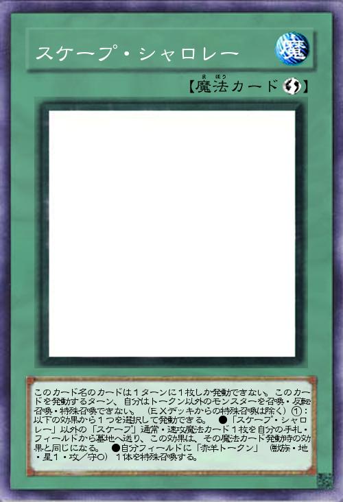 | このカード名のカードは1ターンに1枚しか発動できない。このカードを発動するターン、自分はトークン以外のモンスターを召喚・反転召喚・特殊召喚できない。(EXデッキからの特殊召喚は除く)①:以下の効果から1つを選択して発動できる。 ●「スケープ・シャロレー」以外の「スケープ」通常・速攻魔法カード1枚を自分の手札・フィールドから墓地へ送り、この効果は、その魔法カード発動時の効果と同じになる。 ●自分フィールドに「赤羊トークン」(獣族・地・星1・攻/守0)1体を特殊召喚する。 | |||
