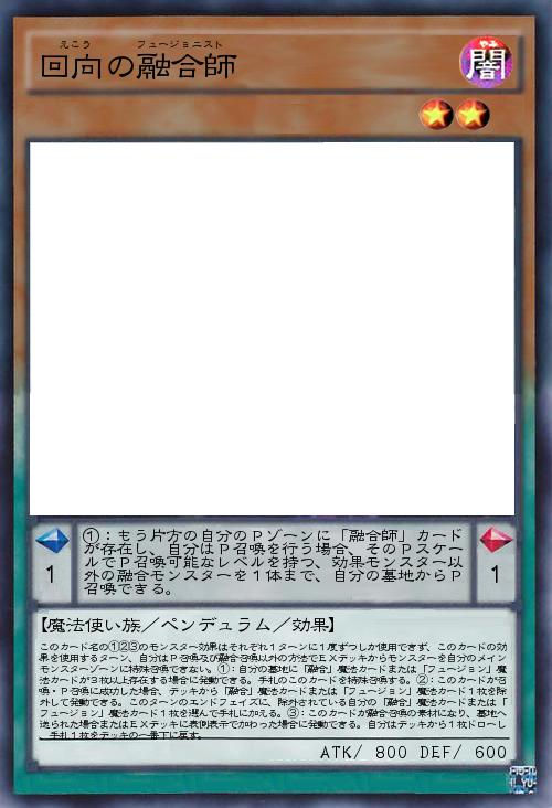 | このカード名の①②③のモンスター効果はそれぞれ1ターンに1度ずつしか使用できず、このカードの効果を使用するターン、自分はP召喚及び融合召喚以外の方法でEXデッキからモンスターを自分のメインモンスターゾーンに特殊召喚できない。①:自分の墓地に「融合」魔法カードまたは「フュージョン」魔法カードが3枚以上存在する場合に発動できる。手札のこのカードを特殊召喚する。②:このカードが召喚・P召喚に成功した場合、デッキから「融合」魔法カードまたは「フュージョン」魔法カード1枚を除外して発動できる。このターンのエンドフェイズに、除外されている自分の「融合」魔法カードまたは「フュージョン」魔法カード1枚を選んで手札に加える。③:このカードが融合召喚の素材になり、墓地へ送られた場合またはEXデッキに表側表示で加わった場合に発動できる。自分はデッキから1枚ドローし、手札1枚をデッキの一番下に戻す。 | |||