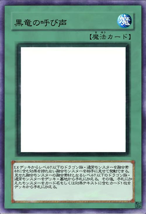 | EXデッキからレベル7以下のドラゴン族・通常モンスターを融合素材に含む効果を持たない融合モンスターを相手に見せて発動できる。見せた融合モンスターの融合素材となるレベル7以下のドラゴン族・通常モンスターをデッキ・墓地から手札に加える。その後、手札に加えたモンスターをカード名もしくは効果テキストに含むカード1枚をデッキから手札に加える。 | |||
