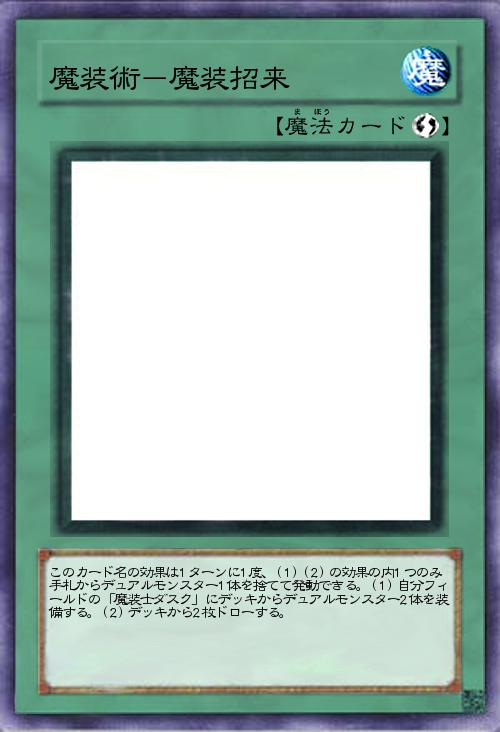 | このカード名の効果は1ターンに1度、(1)(2)の効果の内1つのみ手札からデュアルモンスター1体を捨てて発動できる。(1)自分フィールドの「魔装士ダスク」にデッキからデュアルモンスター2体を装備する。(2)デッキから2枚ドローする。 | |||