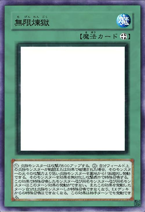 | ①:炎族モンスターは攻撃力500アップする。②:自分フィールド上の炎族モンスターが戦闘または効果で破壊された場合、そのモンスターの元々の攻撃力より低い炎族モンスターを墓地から1体選択し発動できる。そのモンスターを効果を無効化し攻撃表示で特殊召喚する。この効果で特殊召喚したモンスター及び同名モンスター及び同名モンスターはこのターン効果の発動ができない。またこの効果を発動したターン自分は炎族モンスターしか特殊召喚できなくなり、EXデッキからの特殊召喚はできなくなる。この効果は相手ターンでも発動できる。 | |||