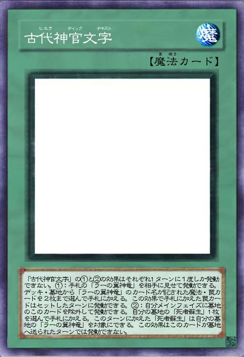 | 「古代神官文字」の①と②の効果はそれぞれ1ターンに1度しか発動できない。①:手札の「ラーの翼神竜」を相手に見せて発動できる。デッキ・墓地から「ラーの翼神竜」のカード名が記された魔法・罠カードを2枚まで選んで手札に加える。この効果で手札に加えた罠カードはセットしたターンに発動できる。②:自分メインフェイズに墓地のこのカードを除外して発動できる。自分の墓地の「死者蘇生」1枚を選んで手札に加える。このターンに加えた「死者蘇生」は自分の墓地の「ラーの翼神竜」を対象にできる。この効果はこのカードが墓地へ送られたターンでは発動できない。 | |||
