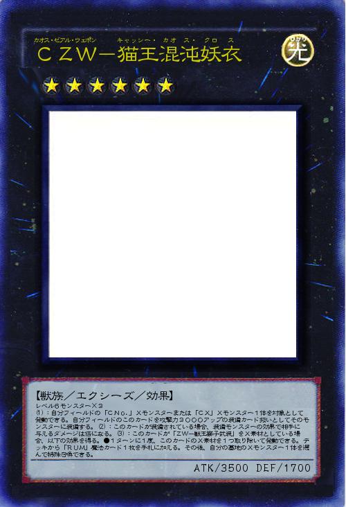 | レベル6モンスター×3 (1):自分フィールドの「CNo.」Xモンスターまたは「CX」Xモンスター1体を対象として発動できる。自分フィールドのこのカードを攻撃力3000アップの装備カード扱いとしてそのモンスターに装備する。(2):このカードが装備されている場合、装備モンスターの効果で相手に与えるダメージは倍になる。(3):このカードが「ZW-獣王獅子武装」をX素材としている場合、以下の効果を得る。●1ターンに1度、このカードのX素材を1つ取り除いて発動できる。デッキから「RUM」魔法カード1枚を手札に加える。その後、自分の墓地のXモンスター1体を選んで特殊召喚できる。 | |||