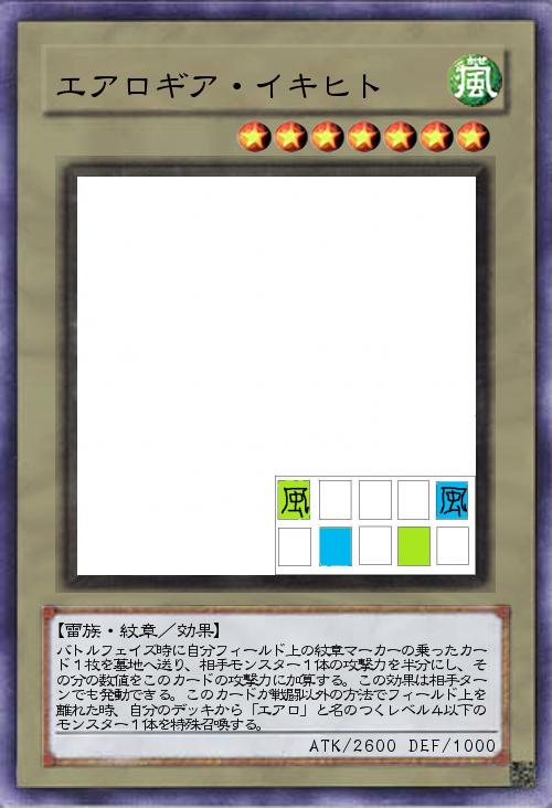 | バトルフェイズ時に自分フィールド上の紋章マーカーの乗ったカード1枚を墓地へ送り、相手モンスター1体の攻撃力を半分にし、その分の数値をこのカードの攻撃力に加算する。この効果は相手ターンでも発動できる。このカードが戦闘以外の方法でフィールド上を離れた時、自分のデッキから「エアロ」と名のつくレベル4以下のモンスター1体を特殊召喚する。 | |||