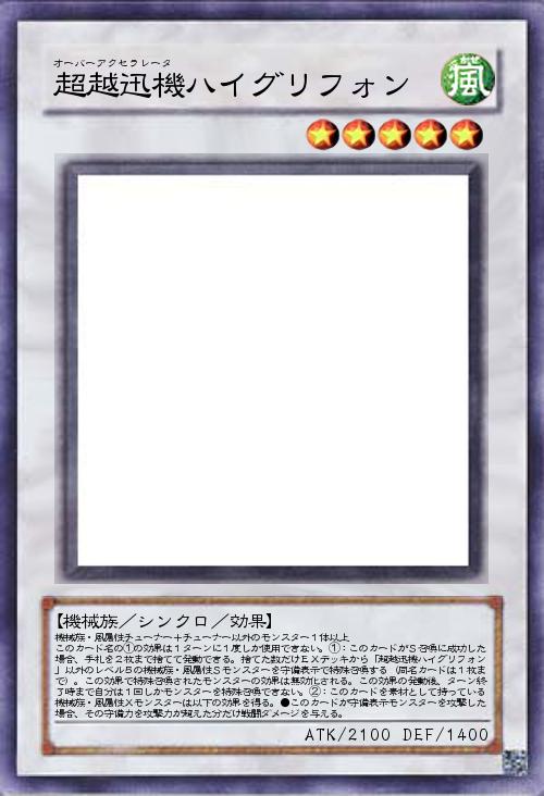 | 機械族・風属性チューナー+チューナー以外のモンスター1体以上 このカード名の①の効果は1ターンに1度しか使用できない。①:このカードがS召喚に成功した場合、手札を2枚まで捨てて発動できる。捨てた数だけEXデッキから「超越迅機ハイグリフォン」以外のレベル5の機械族・風属性Sモンスターを守備表示で特殊召喚する(同名カードは1枚まで)。この効果で特殊召喚されたモンスターの効果は無効化される。この効果の発動後、ターン終了時まで自分は1回しかモンスターを特殊召喚できない。②:このカードを素材として持っている機械族・風属性Xモンスターは以下の効果を得る。●このカードが守備表示モンスターを攻撃した場合、その守備力を攻撃力が超えた分だけ戦闘ダメージを与える。 | |||