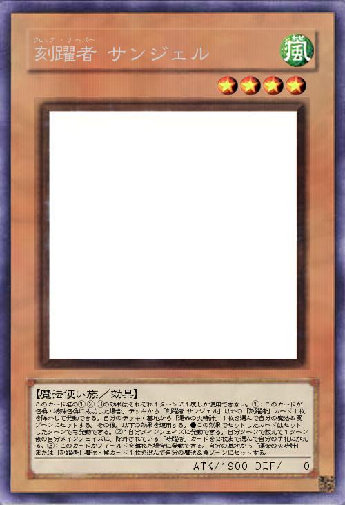 | このカード名の① ② ③の効果はそれぞれ1ターンに1度しか使用できない。①:このカードが召喚・特殊召喚に成功した場合、デッキから「刻躍者 サンジェル」以外の「刻躍者」カード1枚を除外して発動できる。自分のデッキ・墓地から「運命の火時計」1枚を選んで自分の魔法&罠 ゾーンにセットする。その後、以下の効果を適用する。●この効果でセットしたカードはセット したターンでも発動できる。②:自分メインフェイズに発動できる。自分ターンで数えて1ターン後の自分メインフェイズに、除外されている「時躍者」カードを2枚まで選んで自分の手札に加える。③:このカードがフィールドを離れた場合に発動できる。自分の墓地から「運命の火時計」 または「刻躍者」魔法・罠カード1枚を選んで自分の魔法&罠ゾーンにセットする。 | |||