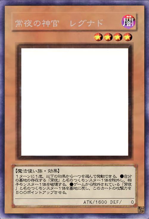 | 1ターンに1度、以下の効果から一つを選んで発動できる。●自分の墓地の存在する「常夜」と名のつくモンスター1体を除外し、相手モンスター1体を破壊する。●ゲームから除外されている「常夜」と名のつくモンスター1体を墓地に戻し、このカードの攻撃力を500ポイントアップさせる。 | |||