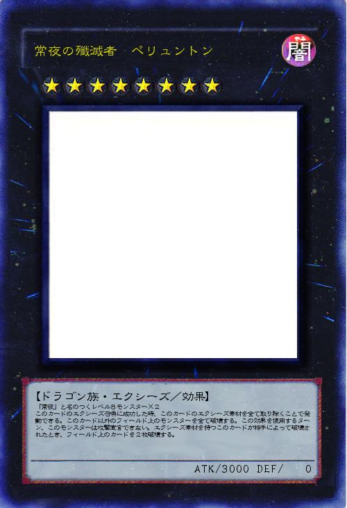 「常夜」と名のつくレベル8モンスター×2 このカードのエクシーズ召喚に成功した時、このカードのエクシーズ素材を全て取り除くことで発動できる。このカード以外のフィールド上のモンスターを全て破壊する。この効果を使用するターン、このモンスターは攻撃宣言できない。エクシーズ素材を持つこのカードが相手によって破壊されたとき、フィールド上のカードを2枚破壊する。 |